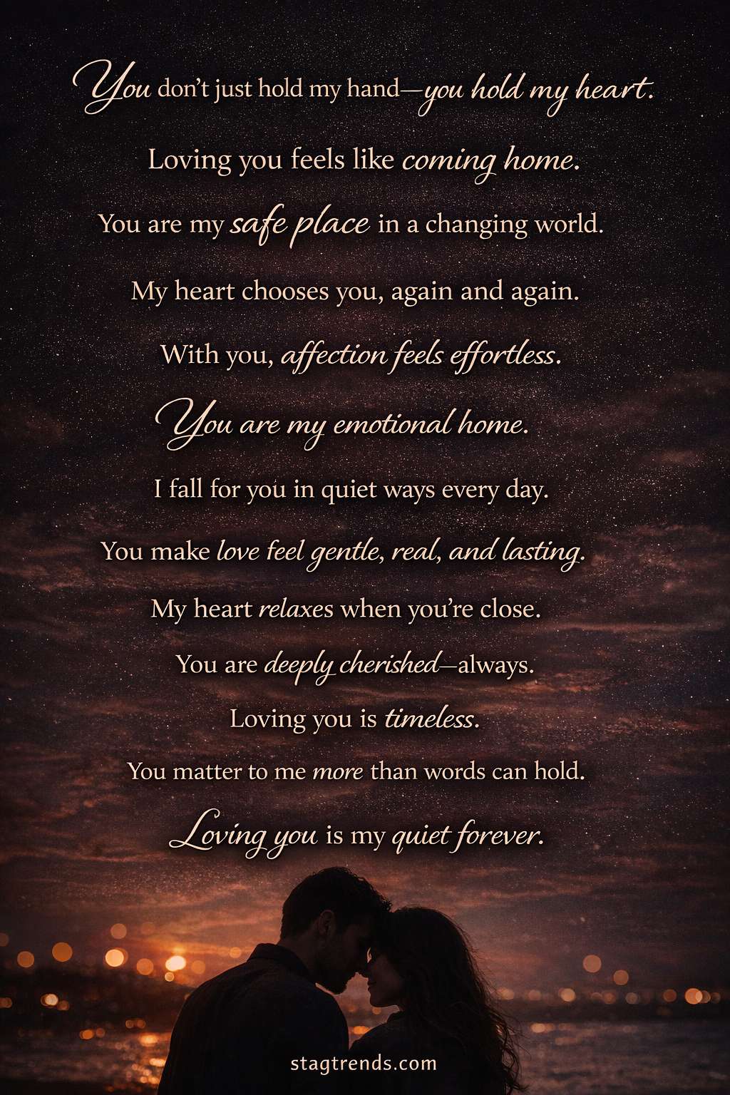 When the relationship moves past the “honeymoon phase” and into the “building a life together” phase, your words need more weight. Emotional affection quotes acknowledge the journey, the struggles, and the unwavering support.