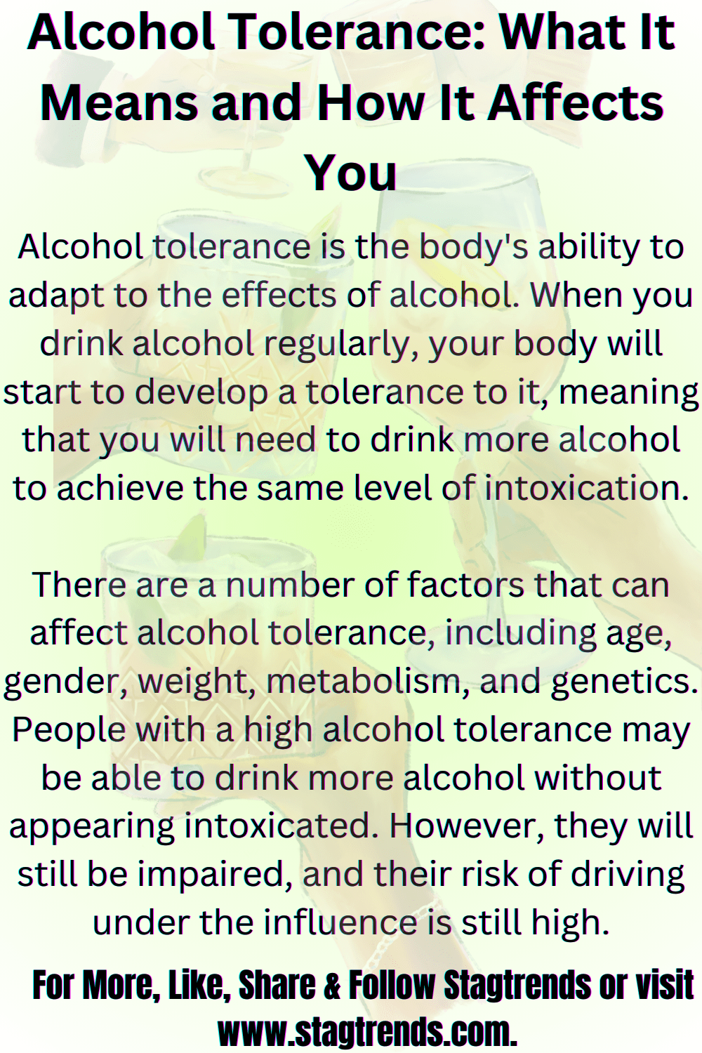Alcohol tolerance is the body’s ability to adapt to the effects of alcohol. When you drink alcohol regularly, your body will start to develop a tolerance to it, meaning that you will need to drink more alcohol to achieve the same level of intoxication.