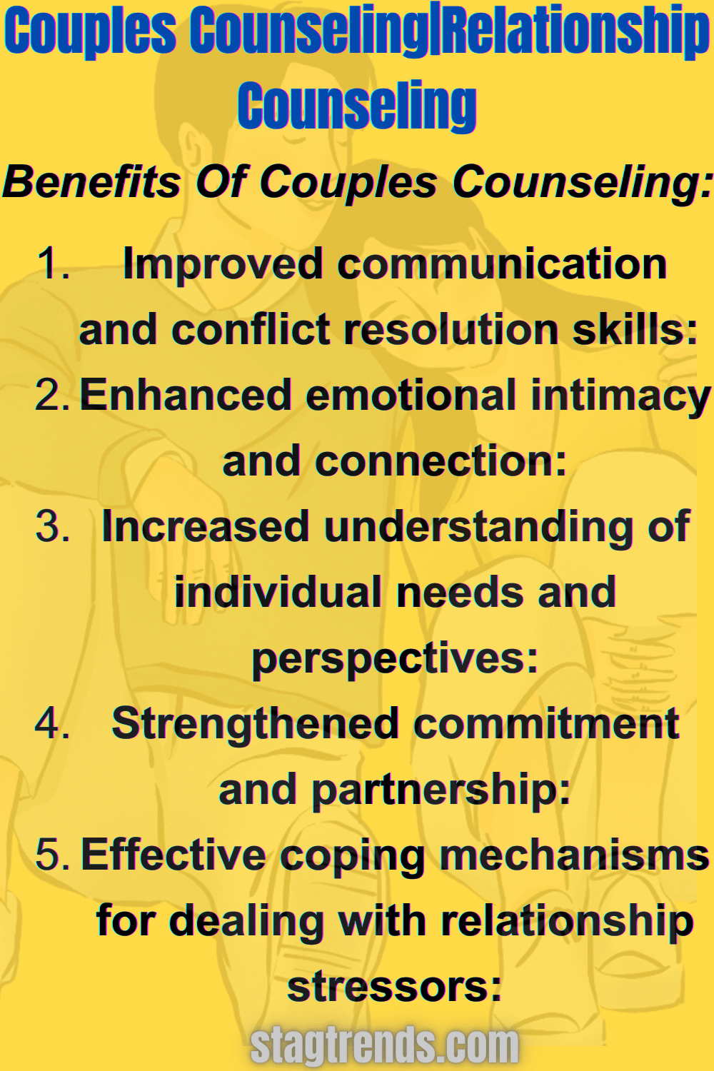 - Improved communication and conflict resolution skills: Couples counseling can help couples learn to communicate more effectively, listen to each other with empathy, and resolve conflicts healthily and constructively.