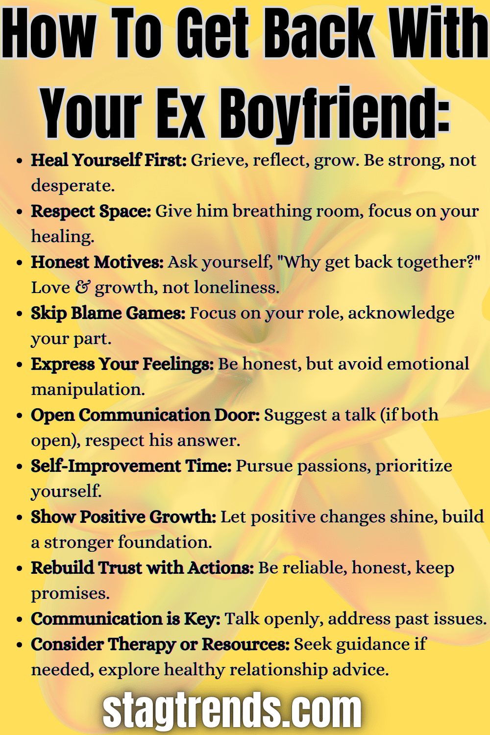 - Set Realistic Expectations: Be realistic about the outcome of your efforts to get back with your ex-boyfriend. Understand that reconciliation may not always be possible or in the best interest of both parties involved.