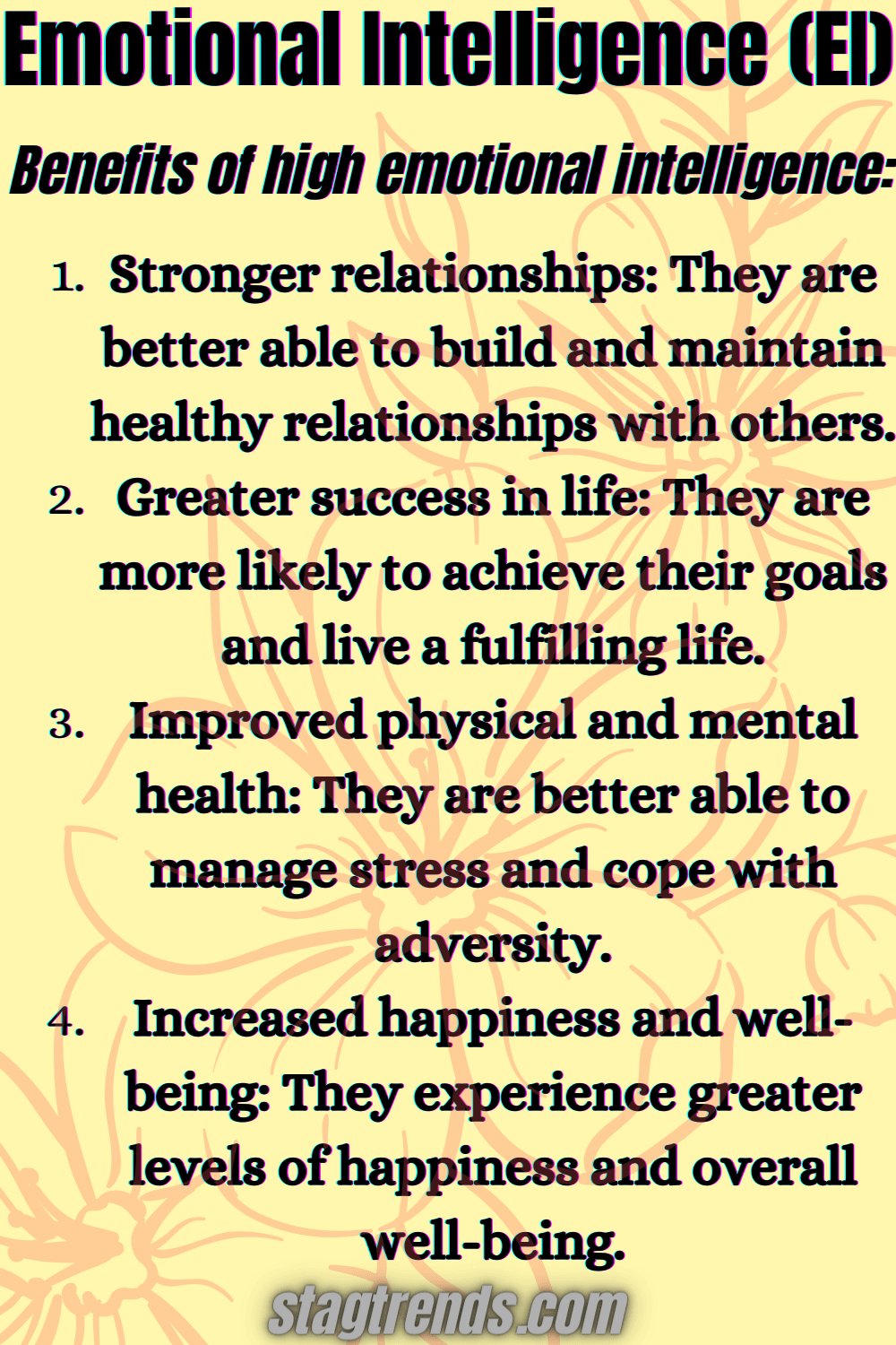 EI can help you become more self-aware, which means understanding your own strengths and weaknesses, your values, and your motivations. This self-awareness can help you make better decisions, set realistic goals, and manage stress.