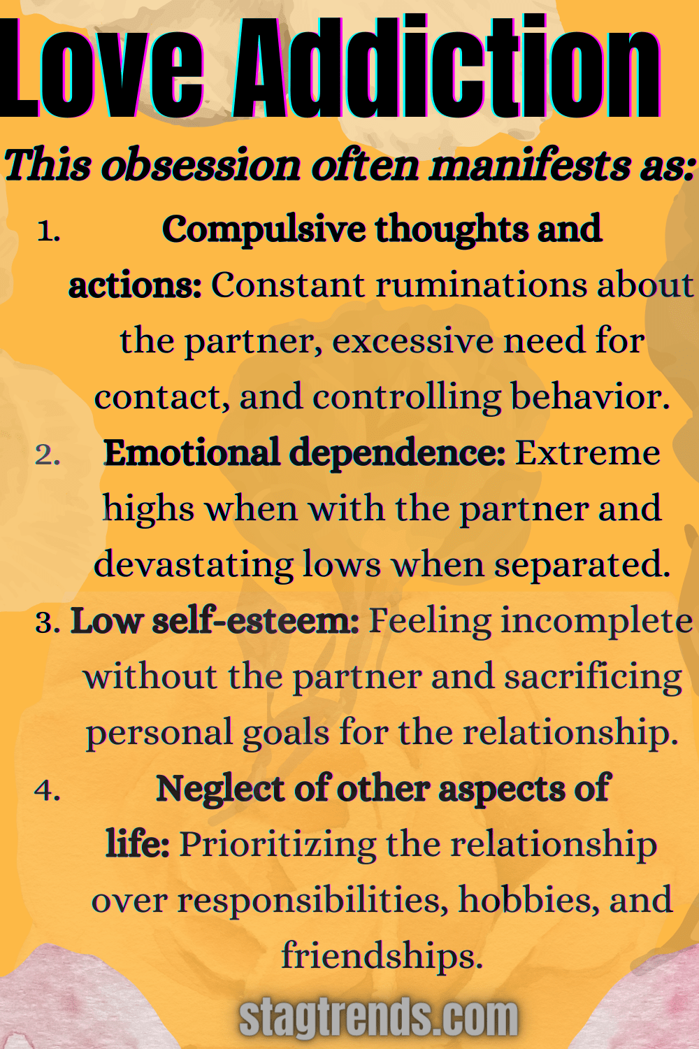 - Personality traits: Individuals with low self-esteem, codependency, or a tendency towards impulsivity may be more susceptible to developing love addiction.