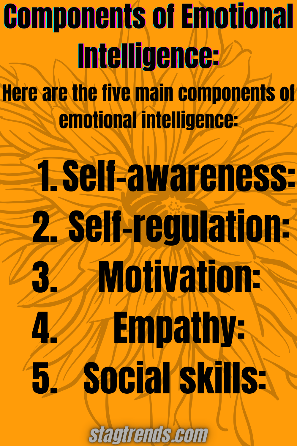 1. Self-awareness: The ability to recognize and understand your own emotions, motivations, and values. 2. Self-regulation: The ability to manage your own emotions and impulses. 3. Motivation: The ability to use your emotions to set and achieve goals. 4. Empathy: The ability to understand and share the feelings of others. 5. Social skills: The ability to communicate effectively and build positive relationships with others.