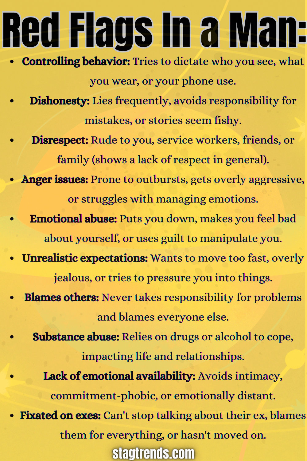 Red flags in a man can indicate potential issues or concerns in a relationship or interaction. Love is a beautiful thing, but navigating the dating world can be a minefield. While butterflies and sparks are exciting, it’s crucial to pay attention to potential red flags in a man to avoid getting swept away by the wrong person.