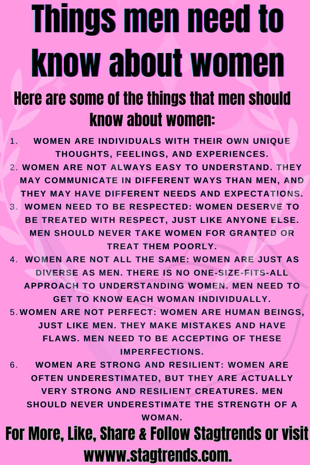 - Women are not all the same: Women are just as diverse as men. There is no one-size-fits-all approach to understanding women. Men need to get to know each woman individually.