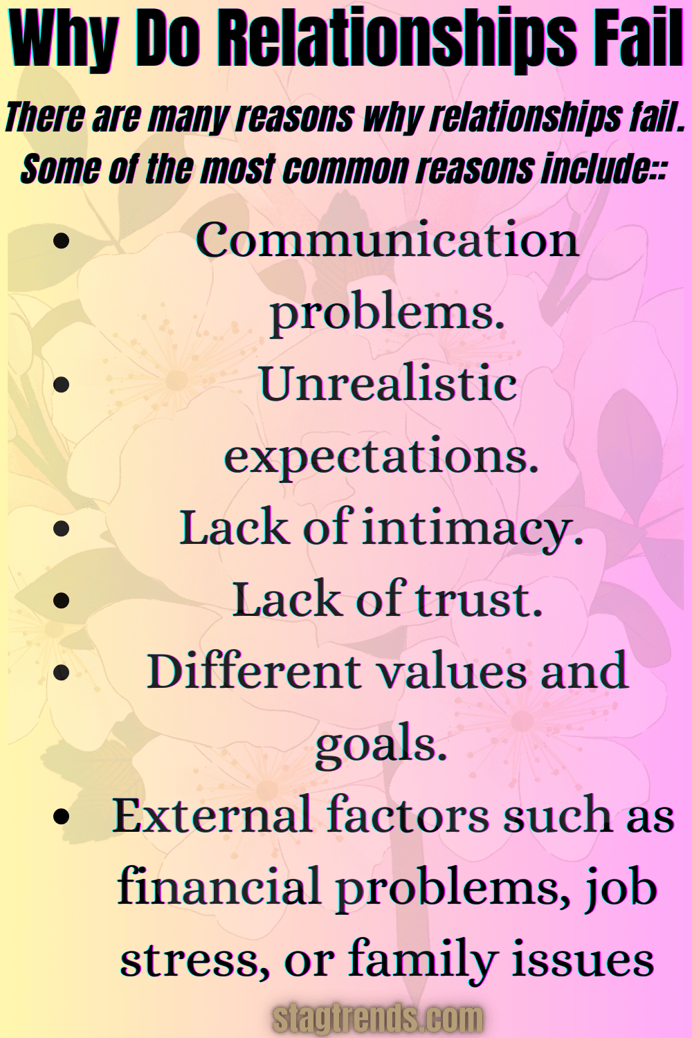 There are many reasons why relationships fail. Some of the most common reasons include: